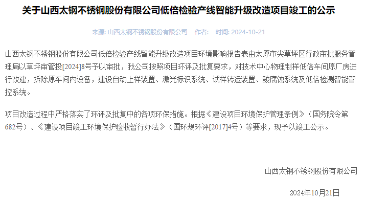 2024年10月21日,山西太钢不锈钢股份有限公司低倍检验产线智能升级改造项目竣工公示。